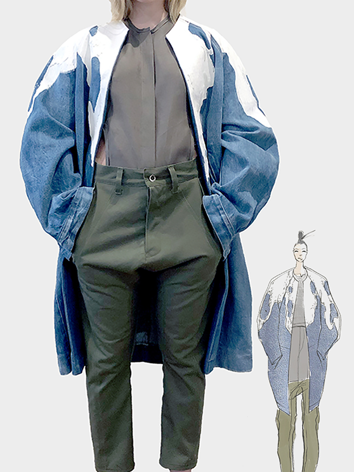 Next Image 1_burdge_aaron Washed denim cocoon coat with screenprint and glass beading; silk organza top; cotton twill drop trouser